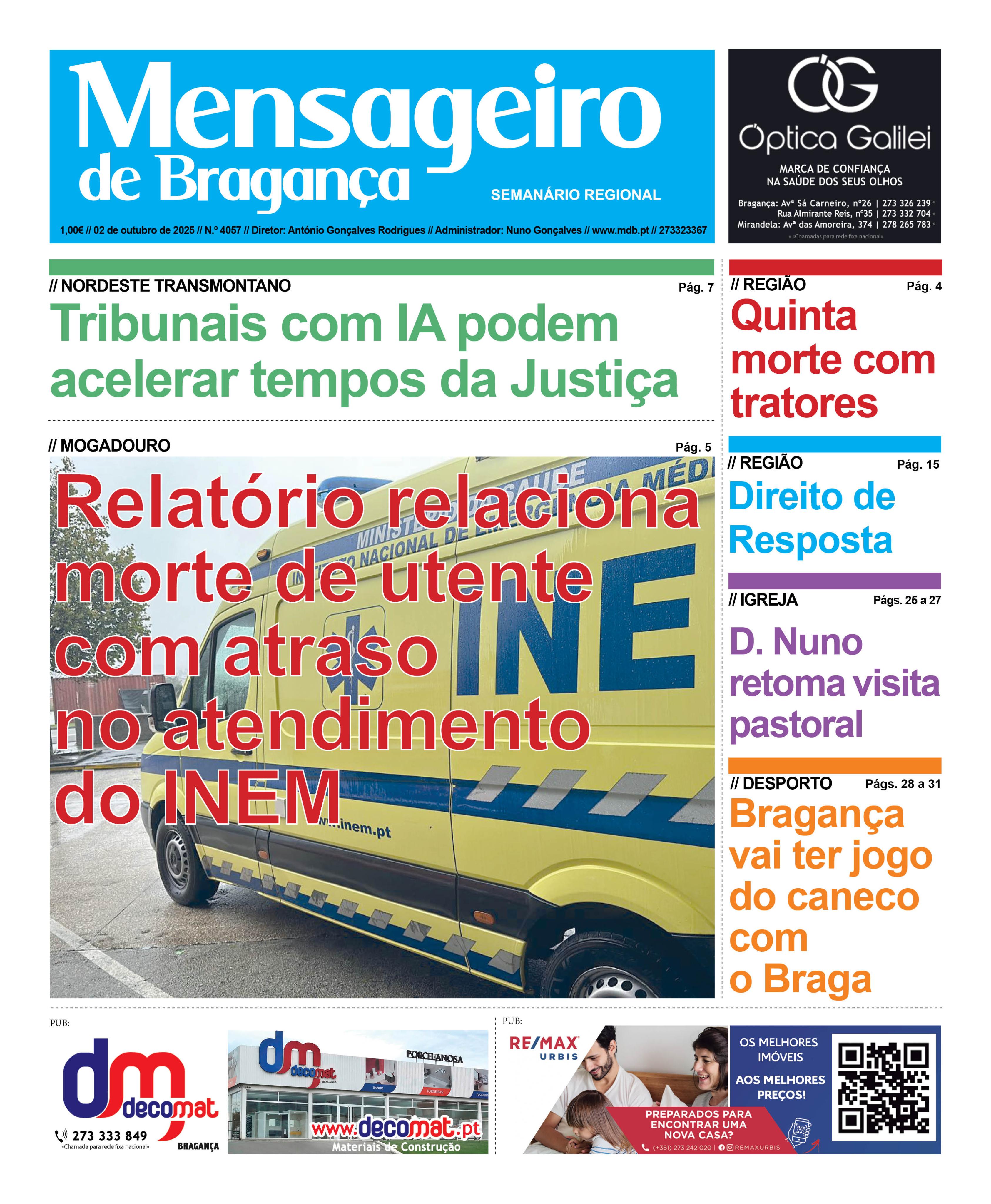 Data Edição Qui, 10/02/2025 - 12:00 Versão completa em PDF, disponível para assinantes. Informação acerca das assinaturas aqui Para fazer login aqui Notícias nesta edição: Presidente do Supremo Tribunal de Justiça alerta para riscos éticos do uso de inteligência artificial nos tribunais GNR deteve já três pessoas este ano por incêndio florestal Fogos deixaram marcas irreversíveis na paisagem e floresta do território de três concelhos do sul do distrito IGAS concluiu que atraso no socorro pode ter sido fatal em caso denunciado pelo Mensageiro ULS pretende investir seis milhões de euros até final de julho de 2026 em obras e equipamento “Juntos a reciclar ++”: projeto da região de Bragança apoiado pela SPV Candidatos à Câmara querem credibilidade para retoma da exploração mineira Adriano Menino (PS) apresentou programa e equipa mas com reparos ao PSD PSD apresentou candidatos a todos órgãos autárquicos com farpas à governação socialista Candidato do PS à tem 12 propostas chave para explicar ao eleitorado do concelho Automóvel em chamas no parque de estacionamento do Cardal Vale do Tua vai ter Observatório Móvel de observação das estrelas GNR sinalizou menos 44 idosos isolados no distrito de Bragança PSP detém seis pessoas em Bragança e Mirandela Bispo alerta contra “consumismo desenfreado” na missa do Jubileu dos catequistas D. Nuno Almeida inicia Visita Pastoral a Miranda do Douro Jantar-convívio do grupo “Pastores entre os Montes” reuniu comunidade em Bragança III Jornadas de Formação de Futsal reuniram treinadores em Macedo de Cavaleiros Homem de 47 anos morre em acidente de trator na aldeia de Podence Homem constituído arguido por furto Opiniões nesta edição: José Mário LeiteModeração (ou a falta dela) DECOOs consumidores em Portugal poderão candidatar-se ao programa Elar, a partir de 30 de setembro de 2025 F. Costa AndradeChega? Não, não chega, já sobra! Pe. Estevinho PiresPromoção da arte e dos artistas evita “embirrices” e desencontros nas Igrejas Editorial - António Gonçalves RodriguesA armadilha da crítica fácil José Mário LeiteModeração (ou a falta dela) Paulo Cordeiro SalgadoO que carregamos? Carlos SilvestreO flagelo da falta de professores Mário LisboaA região de Bragança e a mobilidade dos seus habitantes no desenvolvimento de trás os montes