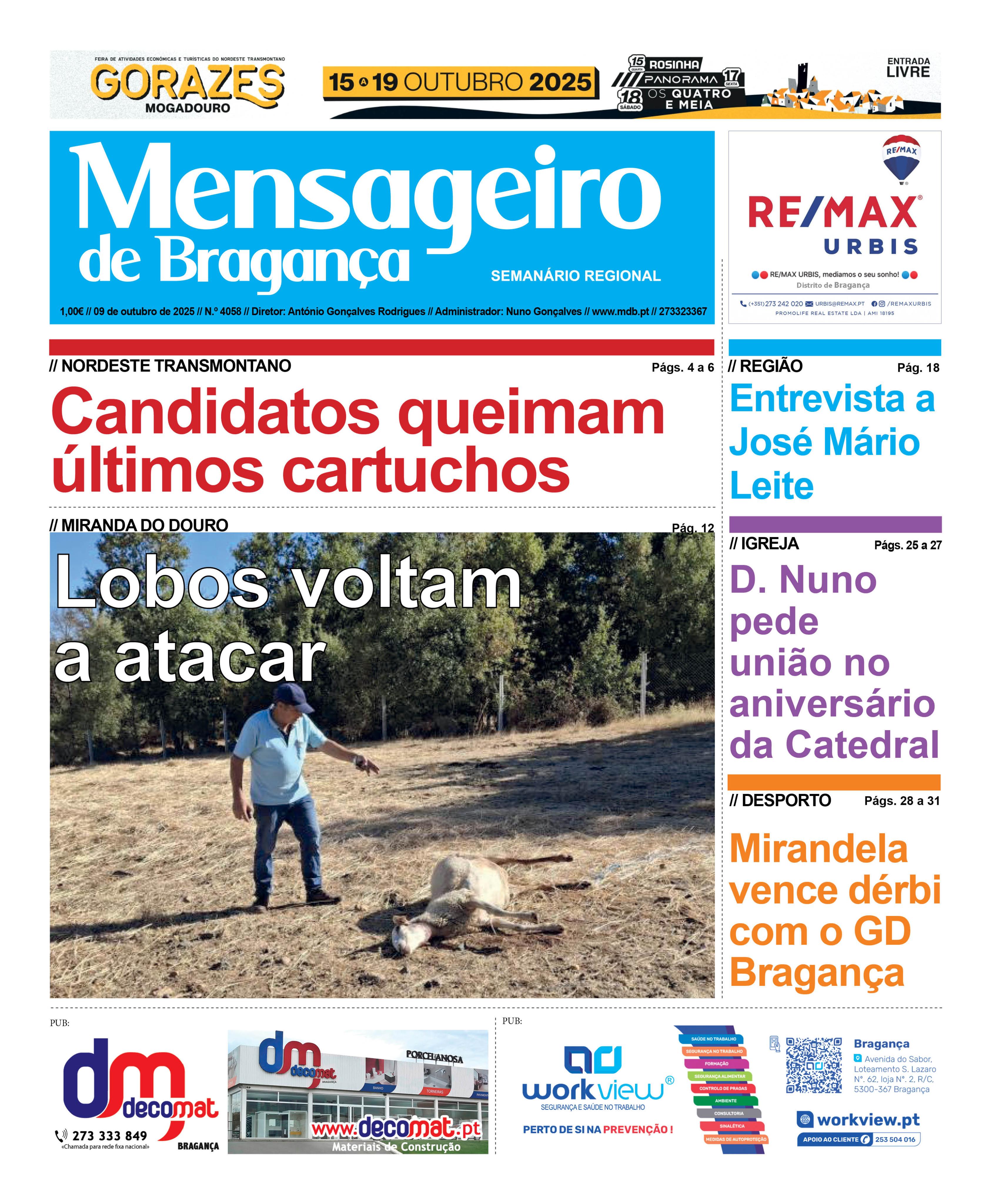 Data Edição Qui, 10/09/2025 - 12:00 Versão completa em PDF, disponível para assinantes. Informação acerca das assinaturas aqui Para fazer login aqui Notícias nesta edição: Deputado Carlos Guimarães Pinto quer a Iniciativa Liberal a eleger em Bragança Montenegro prometeu que estrada Bragança-Rio de Onor é para avançar Distrito de Bragança “ganhou” mais de 800 eleitores nos últimos três meses Isabel Ferreira quer gabinete de apoio aos agricultores e solução para a Praça Camões ULS abre novas Unidades de Saúde Familiar que permitem que mais pessoas tenham médico de família Trabalhadores do STUB fazem greve ao trabalho amanhã Familiares das vítimas do incêndio no lar “Bom Samaritano” desesperam por respostas “Outubro Rosa” repleto de desafios, ações de informação, sensibilização e solidariedade Fundação Cónego Manuel Joaquim Ochôa benzeu nova carrinha Feira dos Gorazes decorre de 15 a 19 outubro com 130 expositores e um orçamento de 220 mil euros No lar de Izeda a alegria chama-se Pantera e Violeta Cuidar bem de quem cuida granjeou prémio Excelente pela felicidade que se vive no Centro Paroquial de Izeda “A nomeação de Secretário-Geral para a Investigação trouxe com ela um acréscimo de responsabilidade" Estudante brigantino premiado na China Odete Ferreira apresenta novo livro no encerramento do Palavrarte Fernanda Ferreira lança segundo livro de uma trilogia Santuário dos Cerejais tem novo monumento dedicado ao Coração de Maria Peregrinação Jubilar do Arciprestado de Moncorvo Bispo D. Nuno Almeida deixa mensagem de união no aniversário da dedicação da Catedral CTM Mirandela 100 por cento vitorioso no arranque da 1.ª Divisão Opiniões nesta edição: Amândio CorreiaAs eleições autárquicas e a segurança pública Editorial - António Gonçalves RodriguesPor um voto se ganha, por um voto se perde Carlos SilvestreO flagelo da falta de professores F. Costa AndradeAutárquicas 2025, a crónica da vulgaridade! - O lodo José Mário LeiteSentido de Estado (ou a falta dele) Henrique FerreiraA Direita Chegou. Cuidemos do «Doente PSD»