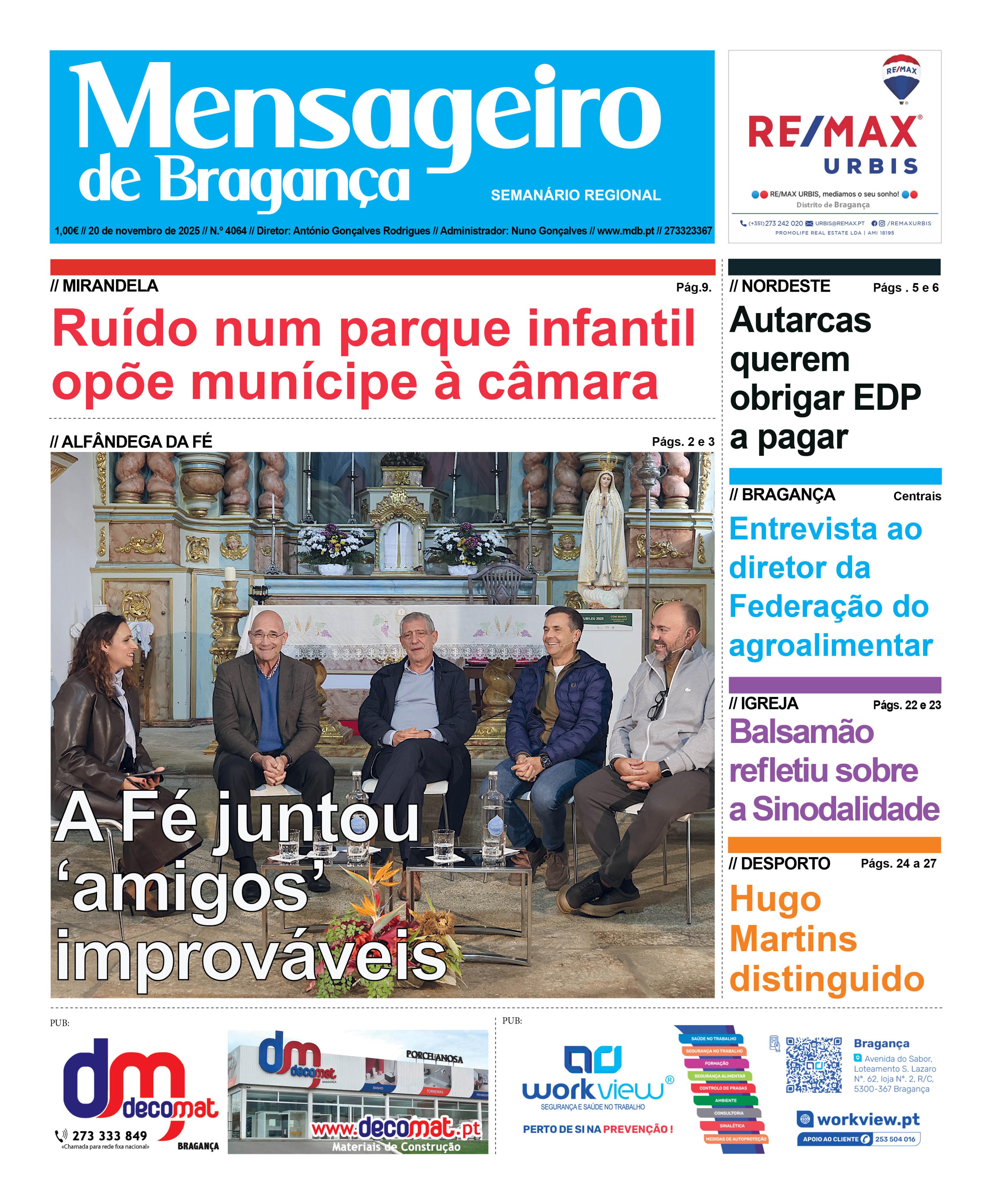 Data Edição Qui, 11/20/2025 - 12:00 Versão completa em PDF, disponível para assinantes. Informação acerca das assinaturas aqui Para fazer login aqui Notícias nesta edição: Ordem dos Farmacêuticos organizou fórum regional dos Estados Gerais da Bioética em Bragança PNRVT com mais de 2 milhões para investir na conservação da natureza e biodiversidade Autarca de Torre de Moncorvo preside à Associação de Municípios que junta oito concelhos Ferrovias, estradas e Complexo do Cachão propostas pelo PCP para o Orçamento do Estado de 2026 Seis abutres-pretos foram devolvidos à natureza no Douro Internacional “Compensa investir no setor do azeite” Museu do Abade de Baçal “mais aberto ao mundo” disse o secretário de Estado da Cultura Retiro mensal, em Balsamão: O Sínodo e a Comunhão dos Santos em Cristo Mirandelense já marca pela seleção que vai estar no Mundial Fim de semana 100 por cento vitorioso para o CTM Mirandela Macedense enfrenta Os Vinhais na 3.ª eliminatória da Taça de Portugal AF Bragança lança campanha solidária de Natal “Equipar um Sorriso” Hugo Martins distinguido com o primeiro Título de Especialista em Desporto atribuído pelo IPB Casa do Benfica de Alfândega da Fé goleia Futsal Mirandela e mantém liderança isolada Empate a duas bolas marca duelo entre Macedo de Cavaleiros e Minas de Argozelo Derrota mantém Escola Arnaldo Pereira sem pontos no Sub-15 CA Macedo de Cavaleiros empata na deslocação ao Porto D’Ave e segura 2.º lugar Juvenis da Escola Crescer derrotados por “manita” do SC Braga B Fair Play do FC Leão Negro/CSP Vila Flor reconhecido com Cartão Branco Escola Crescer conquista primeiro ponto após empate diante do SC Régua Opiniões nesta edição: F. Costa Andrade3 - Orçamento do Estado, vamos fazer as contas