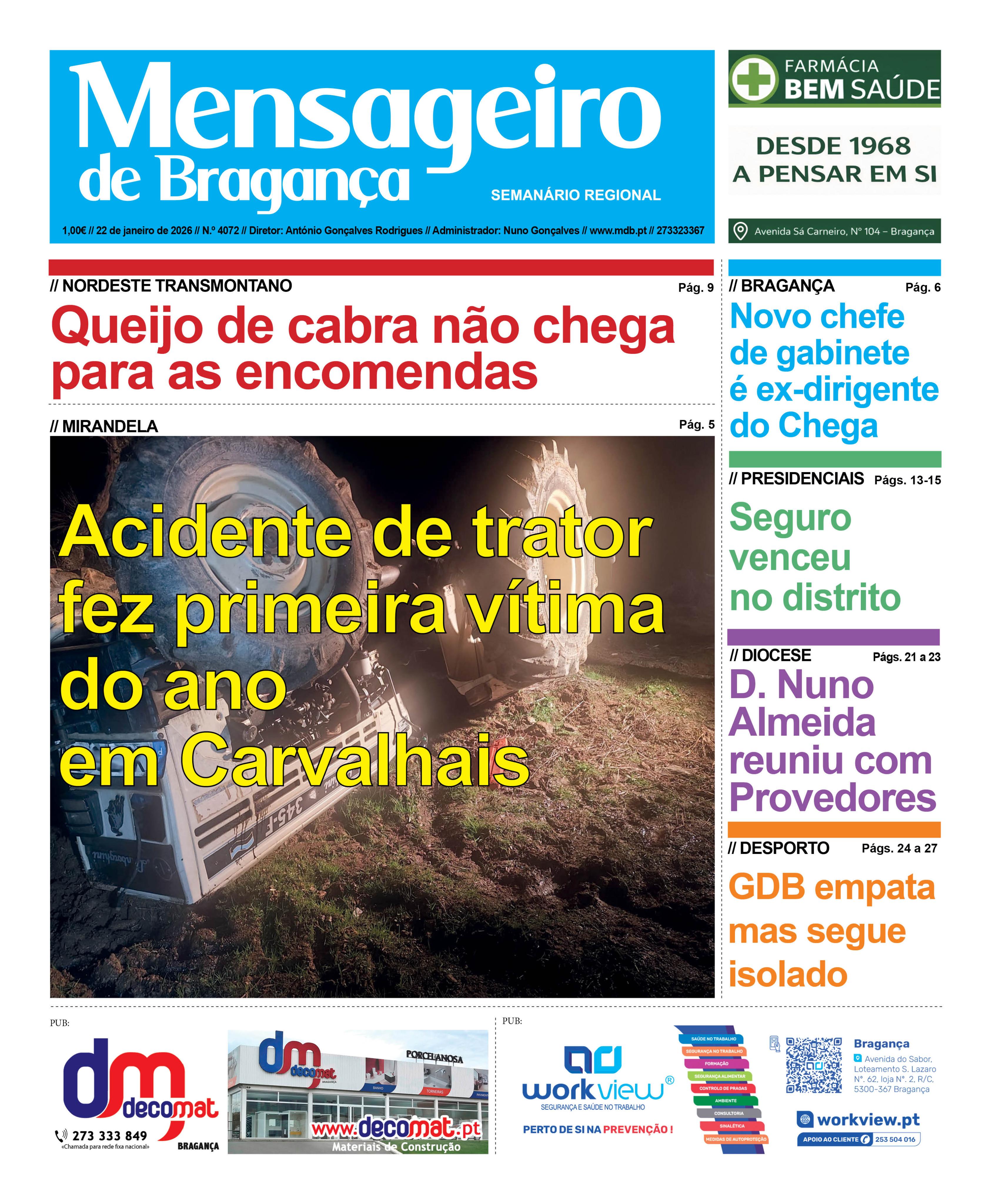 Data Edição Qui, 01/22/2026 - 12:00 Versão completa em PDF, disponível para assinantes. Informação acerca das assinaturas aqui Para fazer login aqui Notícias nesta edição: Projeto de resolução do PCP recomenda reintegração da linha do Tua na rede nacional ferroviária Concluída reabilitação de 12 apartamentos municipais no valor de 600 mil euros Municípios retomam negociações com a Movhera para Fundo António José Seguro venceu no distrito de Bragança mas Ventura ganhou em cinco dos 12 concelhos Os 300 anos do Santuário de Santo Amaro estão a ser assinalados com peregrinação jubilar Palaçoulo acolhe a primeira edição de “La Galhada” Lions Clube angariou fundos para bolsa de estudo GNR realiza patrulhamento para deteção de venenos nos ecossistemas do Planalto Mirandês Misericórdias de Bragança-Miranda saudadas pelo Papa Leão XI Livro sobre Mons. Adelino Paes apresentado este sábado Primeira Assembleia da Unidade Pastoral Senhora da Encarnação Congresso IMPLICATE 2026 propõe um humanismo de rosto humano Projeto de resolução do PCP recomenda reintegração da linha do Tua na rede nacional ferroviária Concluída reabilitação de 12 apartamentos municipais no valor de 600 mil euros Município investe cerca de 300 mil euros em material informático de ultima geração PSP deteve seis condutores em três dias Acidente na A4 faz um ferido próximo de Rio Frio Brigantino Rodrigo Versos sobe ao pódio no Campeonato Europeu de Jiu-Jitsu SC Mirandela perde na Camacha e desce ao quinto lugar Fim de semana 100 por cento vitorioso para as equipas do CTM Mirandela Opiniões nesta edição: Paulo PraçaAno Novo, Luta Nova: Resíduos Urbanos em Portugal Nuno ReisAinda a primeira volta das presidenciais César RodriguesEleições Presidenciais 2026 100 anos depois da Ditadura Militar de 1926 Henrique FerreiraPresidenciais 2026 em espera