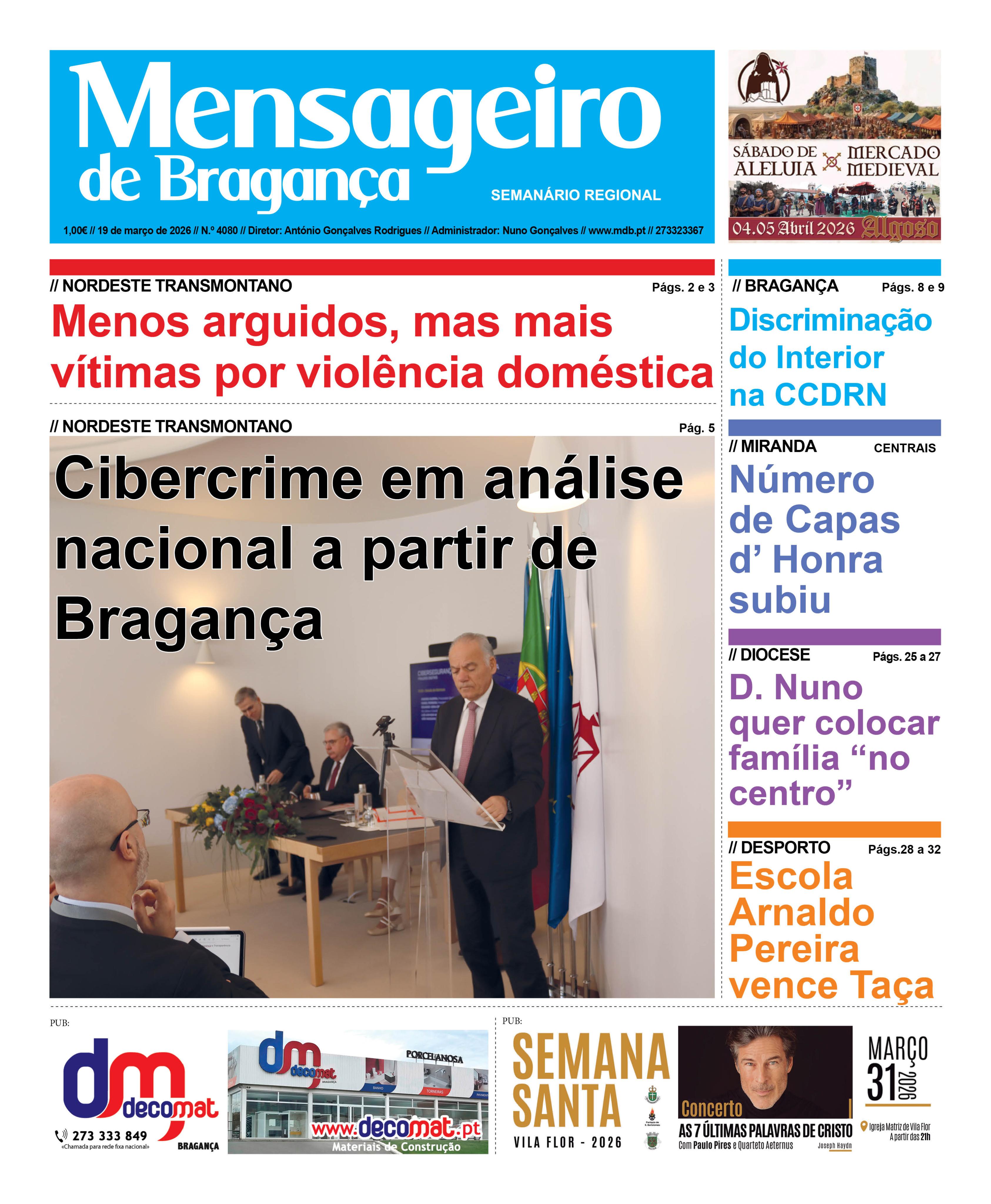 Data Edição Qui, 03/19/2026 - 12:00 Versão completa em PDF, disponível para assinantes. Informação acerca das assinaturas aqui Para fazer login aqui Notícias nesta edição: Município investe 500 mil euros em Centro de Atividades Lúdicas e Históricas de Algoso Prevenção da violência no namoro no agrupamento de escolas de Carrazeda de Ansiães Número de vítimas de violência doméstica aumentou no distrito Conheça as remunerações dos eleitos locais do distrito Município “segura” delagação da ASAE cedendo novo espaço Júlia Rodrigues lamenta falta de representatividade do distrito na “nova” CCDRN Câmara gasta 158 mil euros no apoio às rendas sociais de 128 famílias Argozelo quer renovar a tradição da rosquilha um doce típico da Páscoa IPB e o Paraná lançam programa internacional para acelerar internacionalização de start-ups Mais de duas centenas de Capas d’ Honra Mirandesas inscritas na MatrizPCI. Tino Navarro desvendou pormenores da sua nova série ‘Bragança’ Exposição ‘O Senhor dos Passos’ na antiga igreja da Sé Arte com Movimento no Museu do Abade de Baçal Prémio Literário Guerra Junqueiro Lusofonia 2025 distingue nove escritores Quaresma – um caminho de proximidade com Deus, entre nós e com a natureza D. Nuno Almeida defende que “colocar família no centro é desafio exigente” Podcast “You Quiero Ser Pauliteiro” lança primeiros episódios e celebra a tradição mirandesa Miranda do Douro vence Macedense nos penáltis e conquista Taça Distrital Macedense vence Taça Distrital de juvenis e completa dobradinha Jorge Mariz vence Viana Granfondo e lidera arranque do Superprestígio Opiniões nesta edição: Paulo Cordeiro SalgadoSaúde, Ciência e Cidadania - I Nuno MorenoBragança e a Mordaça: Quando a Liberdade de Imprensa Vira Crime de Perseguição Henrique FerreiraMorreu Jürgen Habermas Carlos MoraisValorizar a vida na comunidade F. Costa AndradeDemocracia: Políticos, Polituqueiros e Politicoides DECOO Sistema de Depósito e Reembolso (SDR) vai finalmente avançar em Portugal e promete mudar a forma como lidamos com garrafas e latas de bebidas.