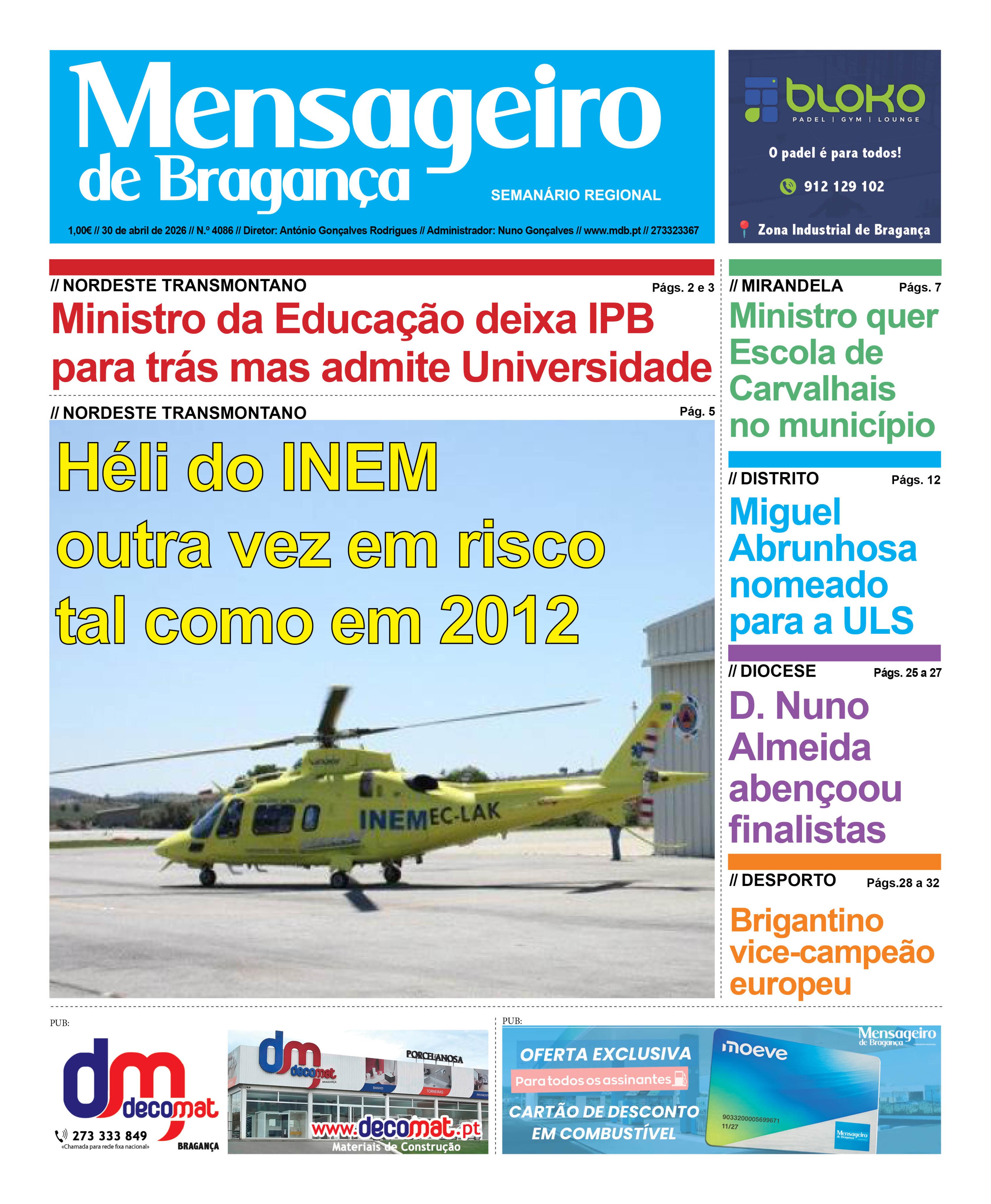 Data Edição Qui, 04/30/2026 - 12:00 Versão completa em PDF, disponível para assinantes. Informação acerca das assinaturas aqui Para fazer login aqui Notícias nesta edição: Assembleia Municipal aprova moção recomendando ao Governo a manutenção do helicóptero do INEM em Macedo de Cavaleiros Petição contra a retirada do 'héli' do INEM de Macedo já conta com quase meio milhar de assinaturas Deputado Hernâni Dias diz que notícias sobre saída do 'héli' do INEM "são falsas" Governo desenterra a ideia de retirar o helicóptero do INEM de Macedo de Cavaleiros Ministro diz que pedido do IPB não será analisado ao mesmo tempo que o do Porto e Leiria IPB será universidade, mas só em parte Município acolhe programa de médicos voluntários com 20 especialistas e nove especialidades Município adquiriu uma nova máquina de rastos por cerca de 200 mil euros Ministro da educação quer EPA de Carvalhais municipalizada Exposição “ponte dos afetos” chama a atenção para os maus tratos na infância Professoras do Conservatório premiadas em concursos Associação Coral Brigantino organiza concerto do Dia da Mãe de grupos infanto-juvenis da cidade Concelho vai ter primeira Bienal dedicada ao Teatro Popular Mirandês Dia Aberto do IPB com recorde de visitantes Feira de Emprego aproximou alunos de empresas Iniciativa educativa intermunicipal implanta projeto-piloto “ Crescer, sentir e descobrir" Evocações um pouco por todo o distrito Comemorações do 25 de abril mais viradas para a população e com discurso de Isabel Ferreira a lembrar o que ainda falta conquistar D. Nuno Almeida abençoou número recorde de finalistas Pastoral Familiar e Lions Clube organizam viagem a León e Astorga Opiniões nesta edição: Manuel PereiraASSUNTO–“DECLARAÇÃO AUTOMÁTICA-MOD.3 DO IMPOSTO SOBRE O RENDIMENTO DAS PESSOAS SINGULARES-IRS E ABRANGÊNCIA EM 2026 DO IRS JOVEM” António Bárbolo Alves“Todas las lhénguas son ua queston política.” Marcellesi i Guespin (1986). “Pour la glottopolitique”. Paulo Cordeiro SalgadoPolítica internacional – breve texto