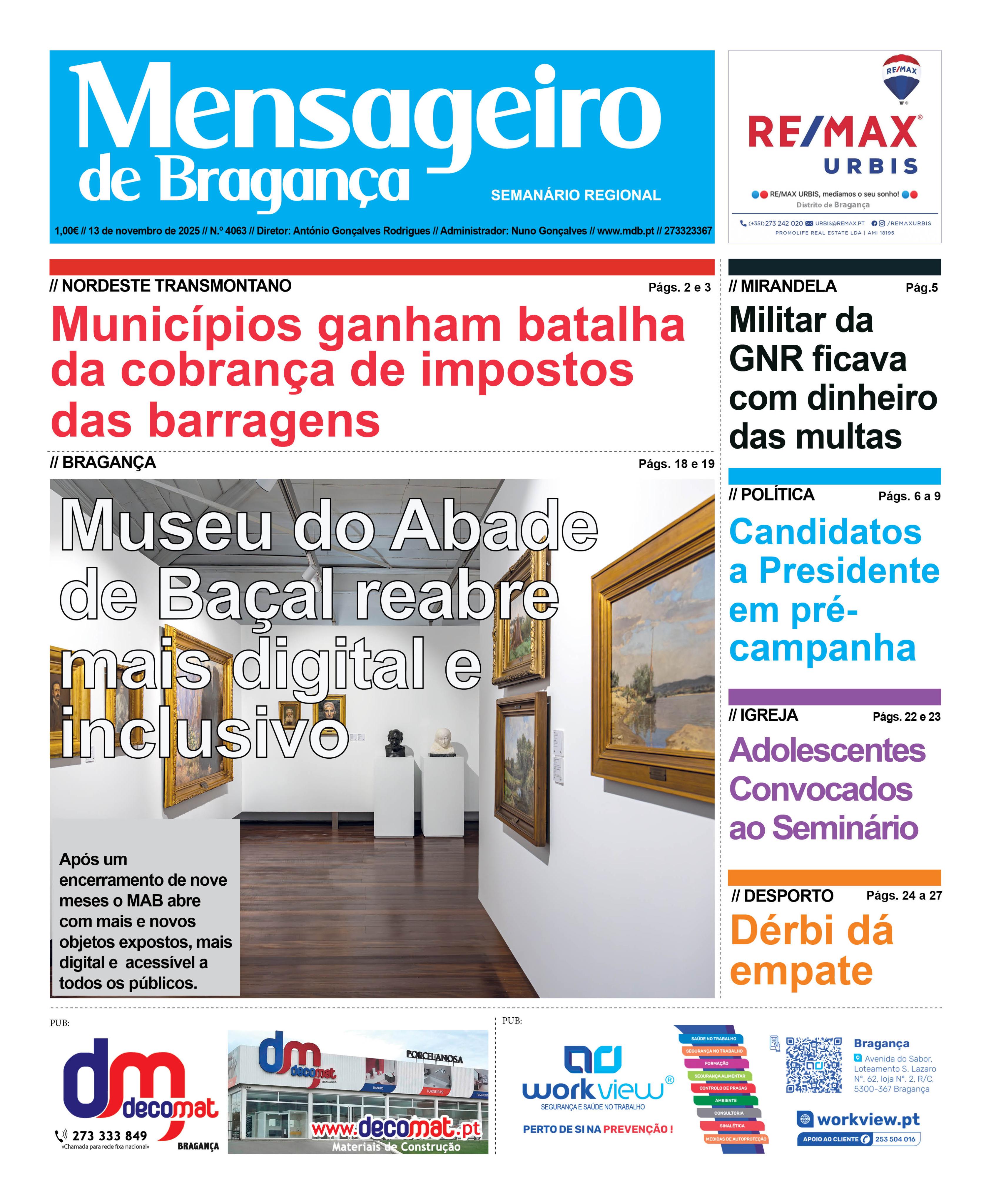 Data Edição Qui, 11/13/2025 - 12:00 Versão completa em PDF, disponível para assinantes. Informação acerca das assinaturas aqui Para fazer login aqui Notícias nesta edição: Seguro aponta o dedo ao “caos e retrocesso” no setor da Saúde Autarcas cantam vitória pela decisão de cobrar impostos pela venda de barragens Governo mantém calendarização da segunda fase da estrada Vinhais-Bragança Militar da GNR detido chegou a levar infrator ao multibanco para pagar multa Almirante Gouveia e Melo passou por Bragança e constatou “potencial gigantesco do interior” Participe no Escape Room ‘Error 404’ - A verdade da Mente e teste os conhecimentos em Saúde Museu do Abade de Baçal reabre amanhã com exposições reforçadas e acessível a todos Primeira sessão do filme ‘As meninas exemplares’ foi em Bragança Formação “Ser Catequista” arranca a 25 de novembro Encontros Improváveis: conversas com fé “Convocação” junta adolescentes no Seminário de São José Alfândega da Fé recebe a 2.ª Resistência TT no Circuito MX-Enduro 193 Essence BJJ soma pódios no Campeonato Nacional Open de Jiu-Jitsu GD Moncorvo sobe ao pódio na 6.ª jornada da Divisão de Honra Mirandela trava líder com reviravolta no marcador Mirandelense João Geraldo vence o WTT Feeder Vila Nova de Gaia 2025 Macedense vence Sangemil e segue em frente na Taça de Portugal de Futsal CA Macedo de Cavaleiros vence Tadim e dá boa resposta após eliminação na Taça FC Mãe d’Água goleia SC Mirandela e mantém liderança no Campeonato Distrital de Sub-16 Jorge Mariz é embaixador do projeto transfronteiriço Iberlobo On Bike Opiniões nesta edição: Paulo Cordeiro SalgadoIntergeracionalidade Nuno MorenoMuseu da Língua Portuguesa – Do Sonho ao Pesadelo - O Desafio Político DECOCompro o que vejo ou vejo o que como? Como as marcas influenciam o que comemos Carlos FernandesAtão in que ficamos? F. Costa Andrade2 - O Orçamento do Estado para 2026, reivindicar sim, mas ..