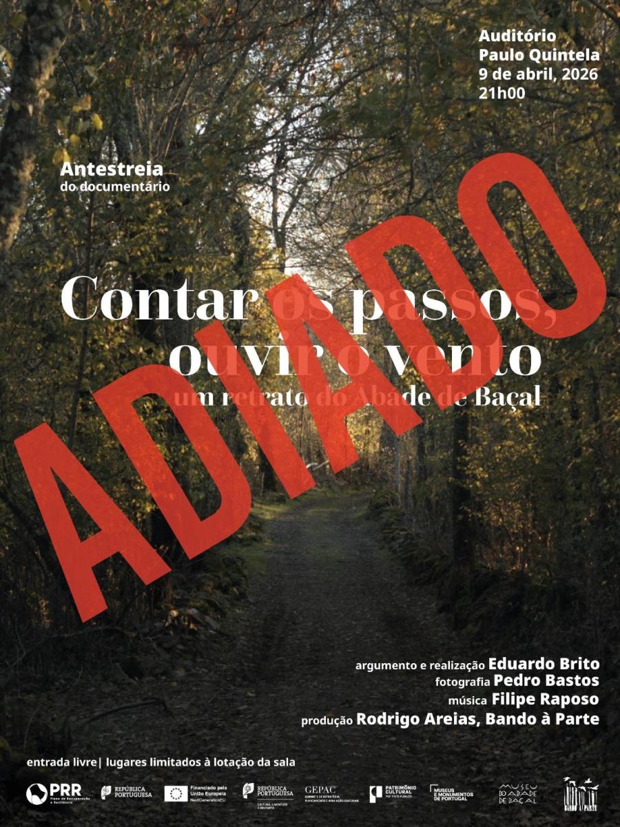 Foi adiada a estreia do documentário "𝗖𝗼𝗻𝘁𝗮𝗿 𝗼𝘀 𝗽𝗮𝘀𝘀𝗼𝘀, 𝗼𝘂𝘃𝗶𝗿 𝗼 𝘃𝗲𝗻𝘁𝗼 - 𝘂𝗺 𝗿𝗲𝘁𝗿𝗮𝘁𝗼 𝗱𝗼 𝗔𝗯𝗮𝗱𝗲 𝗱𝗲 𝗕𝗮𝗰̧𝗮𝗹", prevista para esta quinta-feira, no auditório Paulo Quintela, em Bragança, anunciou o Museu do Abade de Baçal.