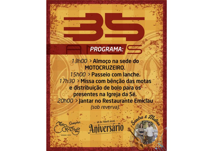 O Motoclube Motocruzeiro de Bragança assinala, no próximo dia 18 de abril, o seu 35.º aniversário, com um programa comemorativo que inclui momentos de convívio, caráter religioso e animação ao longo do dia.