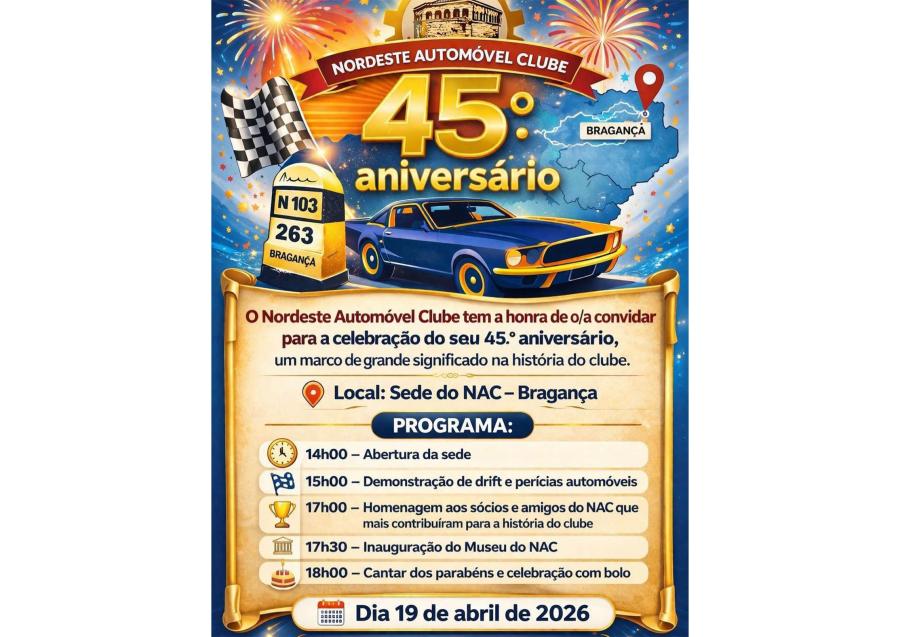 O Nordeste Automóvel Clube (NAC) assinala, no próximo dia 19 de abril de 2026, o seu 45.º aniversário, com um programa comemorativo a decorrer na sede da coletividade, em Bragança.