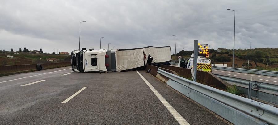 O camião circulava no sentido Espanha-Portugal quando se despistou e tombou sobre o separador central, ocupando as faixas de rodagem.